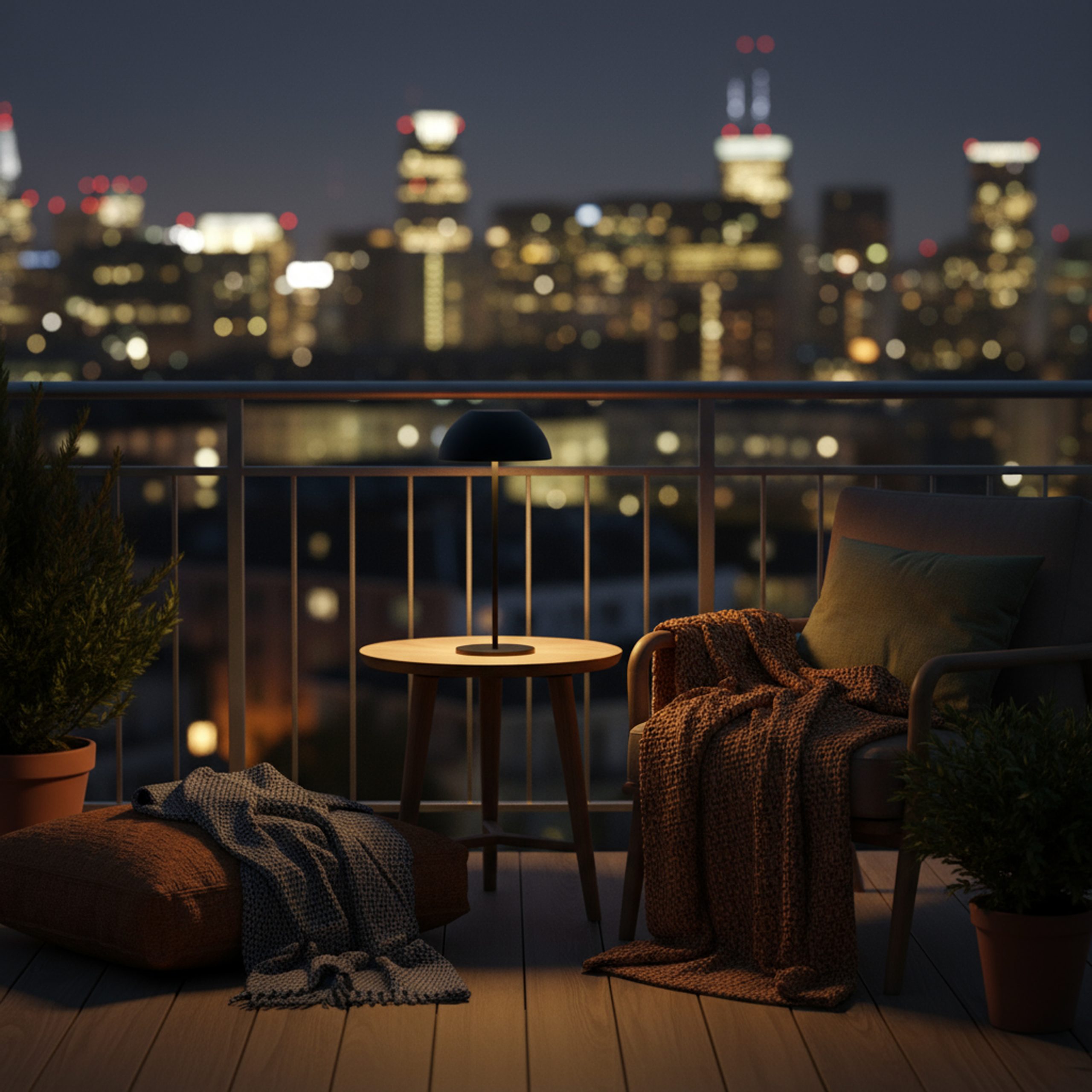 Model odporny na zachlapania (IP44). Nadaje się na balkon i taras. Ciepłe światło 2700 K, dotykowe ściemnianie, USB-C.