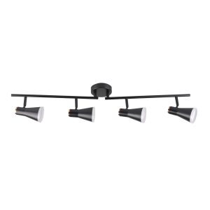 BERG to czteropunktowa nowoczesna lampa, listwa ścienno-sufitowa z niewymiennym źródłem światła LED, wykonana z metalu w kolorze czarnym oraz akrylowej obręczy.