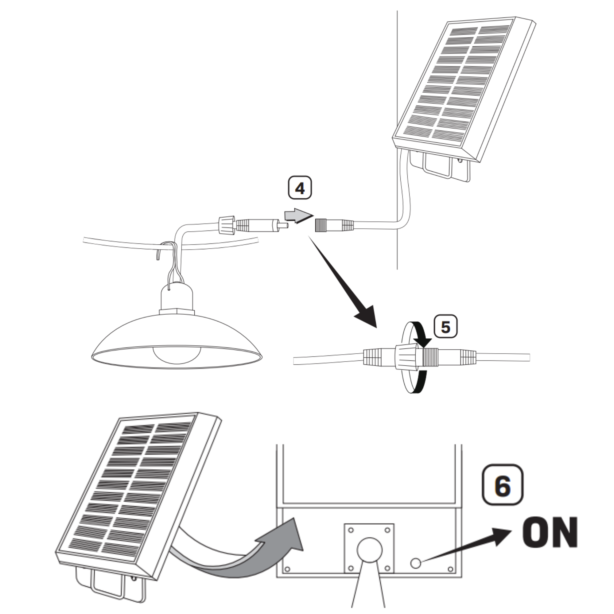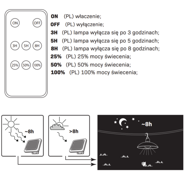 - Lampa wyposażona w osobny panel solarny połączony z lampą przewodem o długości 2,90m
