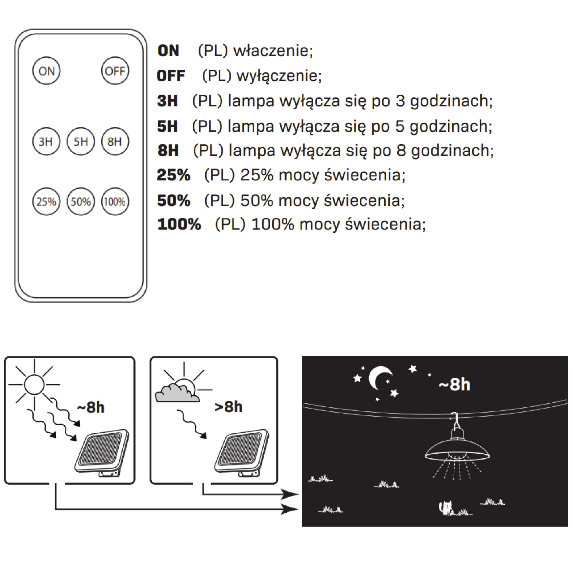 - Czas świecenia po całkowitym naładowaniu akumulatora: max 8h, (mierzono latem, akumulator ładowany w warunkach słonecznej pogody w ciągu dnia)