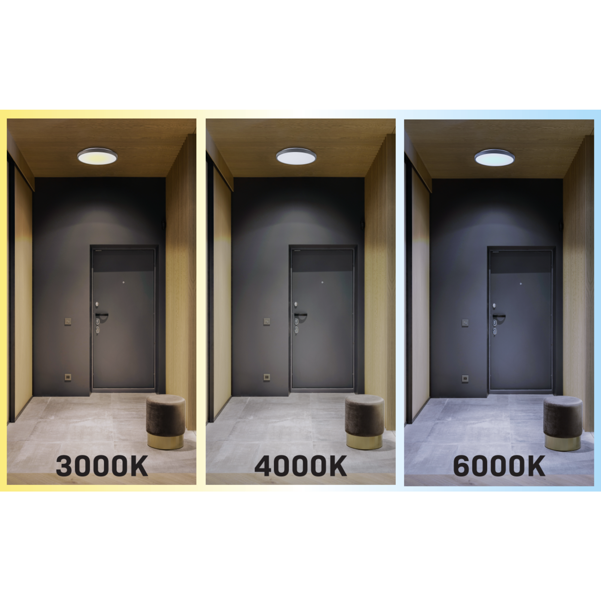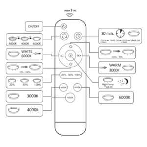 Plafon z pilotem za pomocą którego można płynnie zmienić barwę świecenia od ciepłej białej przez neutralną po zimno białą (3000K-4000K-6000K) oraz wybrać ilość światła, plafon z możliwością ściemniania.