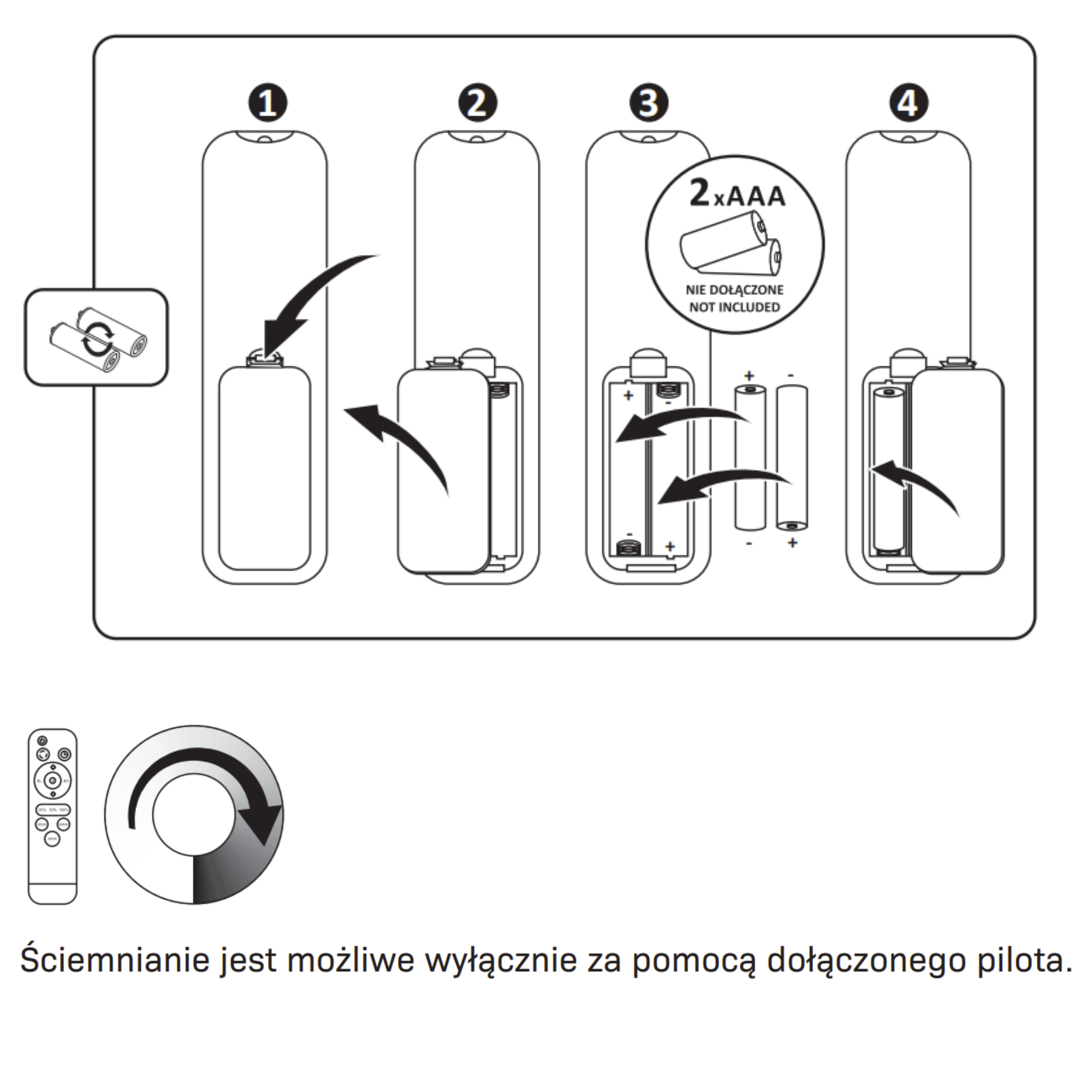 - Brak baterii w zestawie. Pilot wymaga dwóch baterii typu AAA