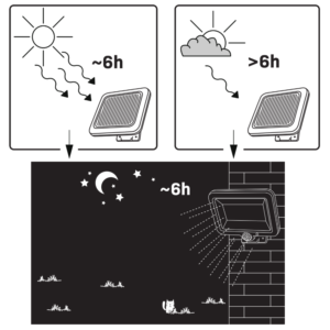 • Czas świecenia po całkowitym naładowaniu akumulatora: max 6h, (mierzono latem, akumulator ładowany w warunkach słonecznej pogody w ciągu dnia)