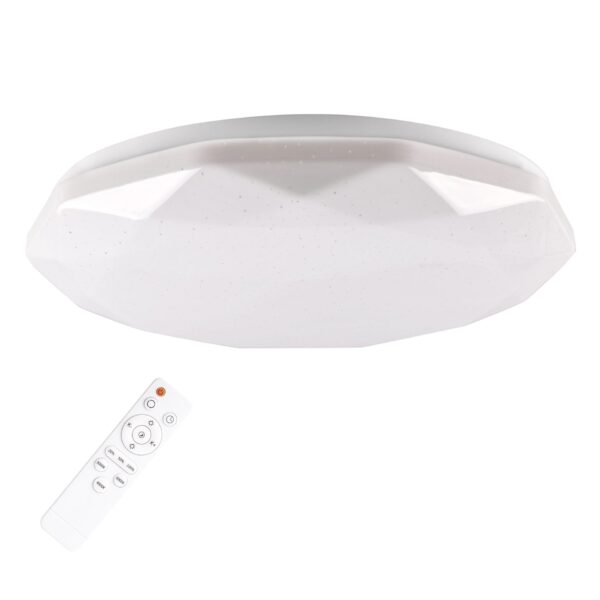 Plafon z pilotem za pomocą którego można płynnie zmienić barwę świecenia od ciepłej białej przez neutralną po zimno białą (3000K-4000K-6000K) oraz wybrać ilość światła, plafon z możliwością ściemniania.