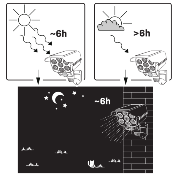 - Czas świecenia po całkowitym naładowaniu akumulatora: max 6h, (mierzono latem, akumulator ładowany w warunkach słonecznej pogody w ciągu dnia)