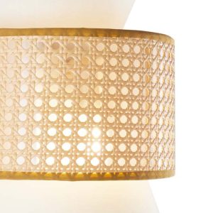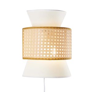 Wewnętrzny klosz wykonano z delikatnej tkaniny, natomiast na zewnątrz znajduje się półwalec z naturalnej plecionki rattanowej w jasnym beżu. To połączenie materiałów tworzy przytulny efekt, a rozproszone światło wydobywa subtelną strukturę rattanu. Dzięki gniazdu E27 możesz samodzielnie dobrać żarówkę – najlepiej filamentową, która podkreśli dekoracyjny charakter kinkietu.