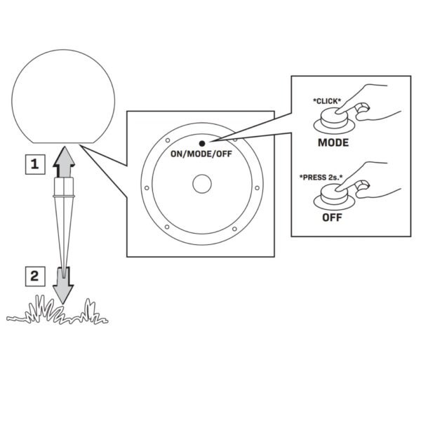 - Lampa jest wyposażona we wbudowane panele solarne. Produkt uruchamia się automatycznie po zapadnięciu zmroku. Funkcje MODE (kolejne naciśnięcia przycisku): zmiana kolorów, zmiana trybów (miganie, szybkie miganie, powolne miganie, płynna zmiana kolorów)