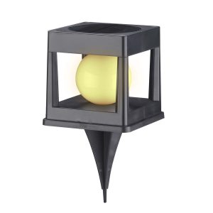 Nowoczesna lampa solarna wbijana w ziemię w eleganckim, czarnym kolorze, idealna do ogrodu, tarasu czy na ścieżki. Lampa ma przestrzenny kształt sześcianu, w którego wnętrzu znajduje się świecąca biała kulka, emitująca neutralne, ciepłe światło o temperaturze 4000K.
