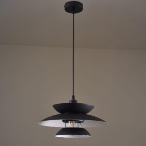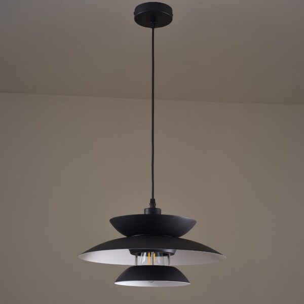 Piękna i niebanalna lampa wisząca BERIT pokryta została czarną satynową farbą a jej spód pomalowany został na biało.