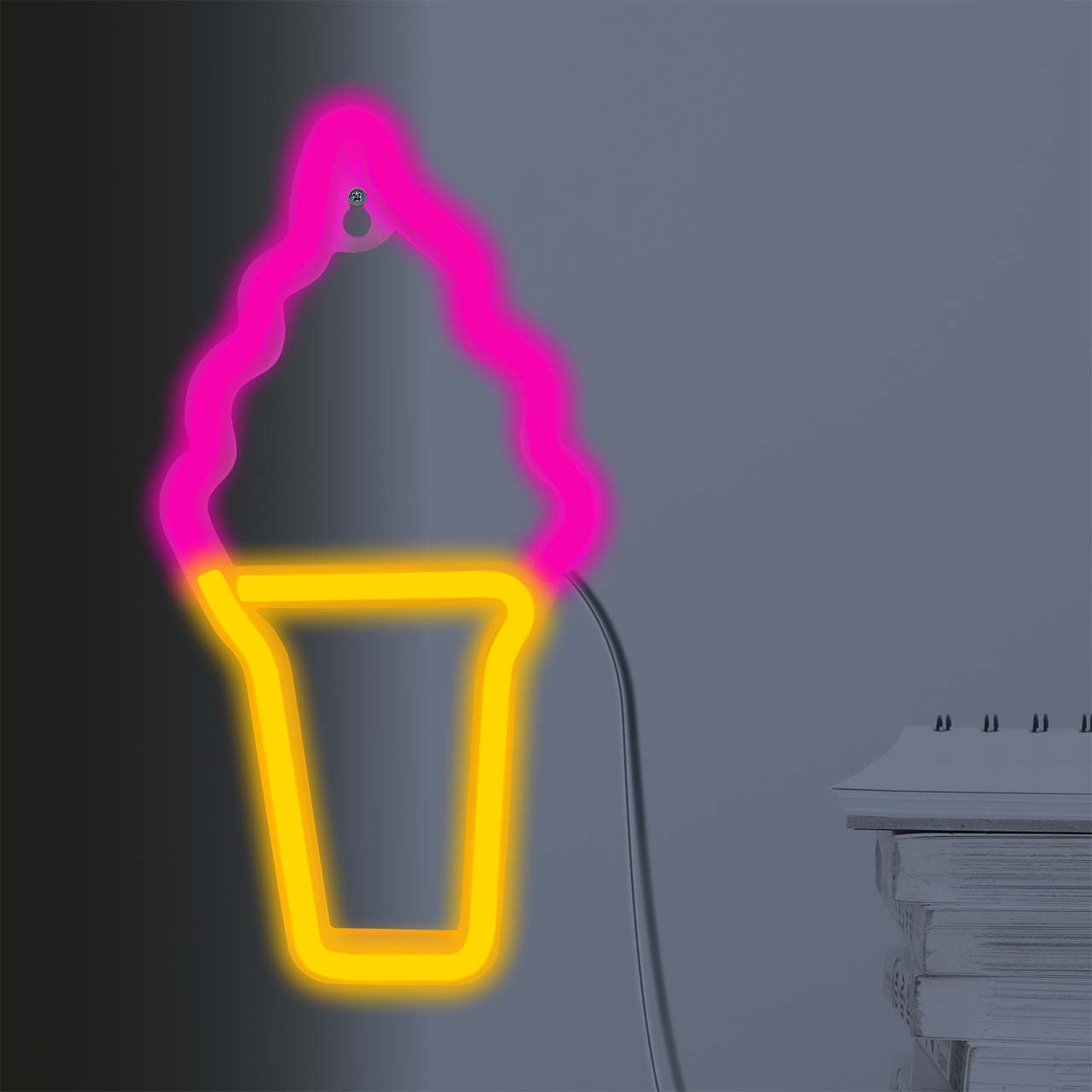 Słodki neon LED w kształcie lodów rożka – idealny do letnich aranżacji, pokoju dziecięcego lub cukierni. Kolorowe światło LED tworzy radosny klimat. (IP20, USB, lekka konstrukcja).