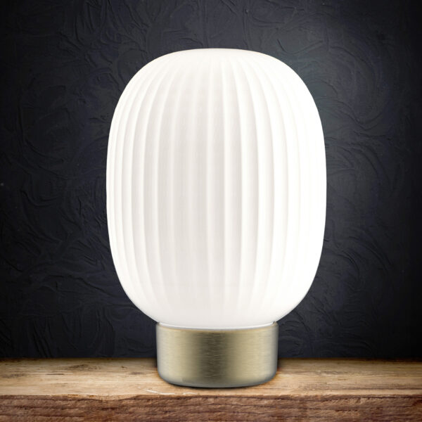 Lampka dekoracyjna stołowa LED LATTE 329837 to eleganckie połączenie białego mlecznego szkła i złotej metalowej podstawy, idealne do salonu czy sypialni.
