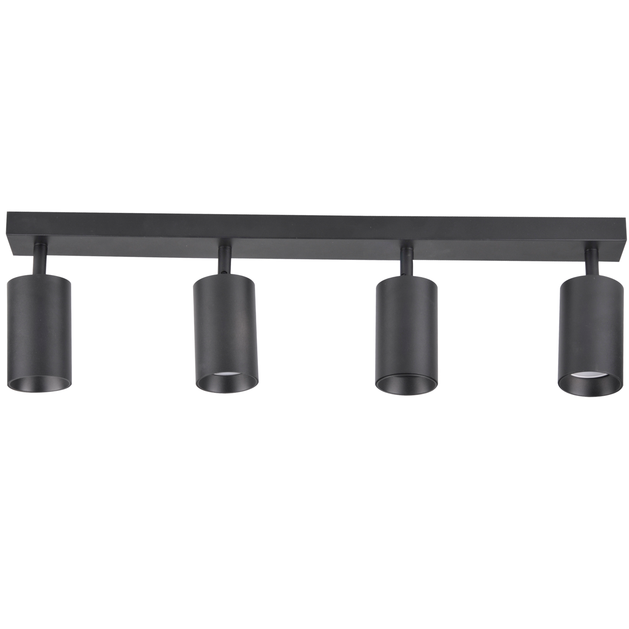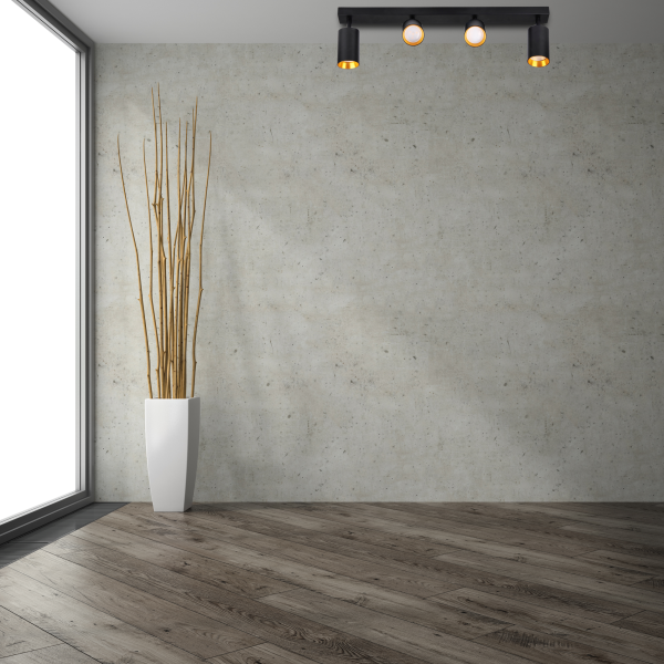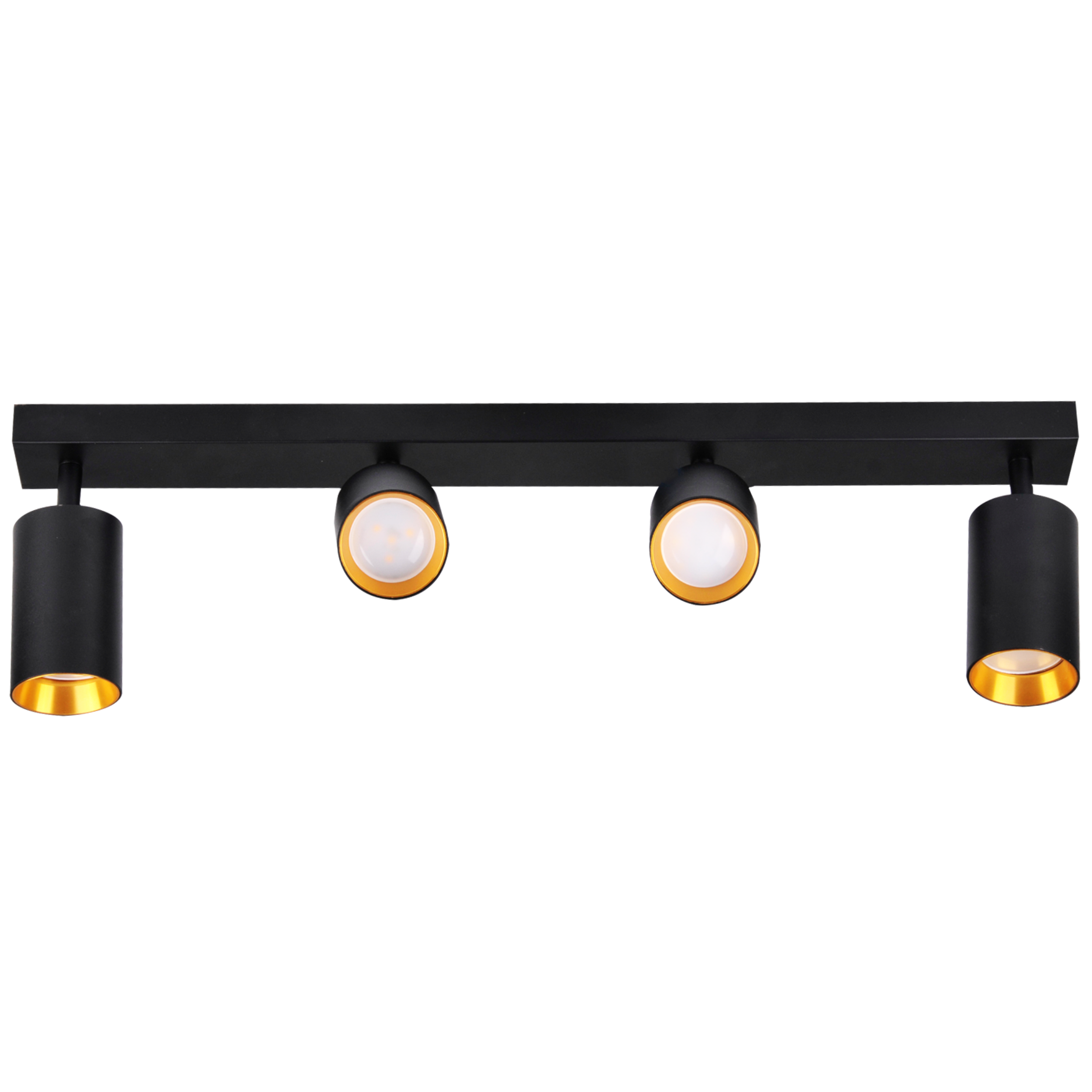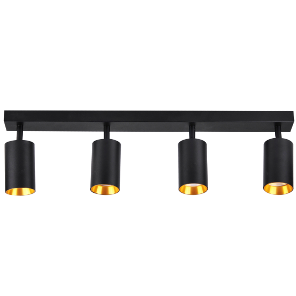 MARIBEL to czteropunktowa, nowoczesna oprawa, spot z wymiennym źródłem światła, wykonana z aluminium w kolorze czarnym. Oprawa posiada osiem pierścieni – cztery w kolorze czarnym, cztery w kolorze złotym.