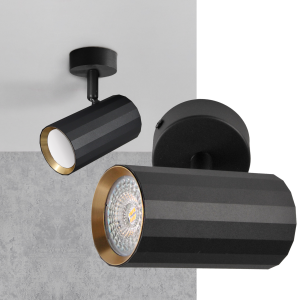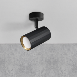 NICEA to nowoczesna oprawa, spot ścienno-sufitowy z wymiennym źródłem światła, wykonana z aluminium w kolorze czarnym ze złotym odkręcanym pierścieniem.