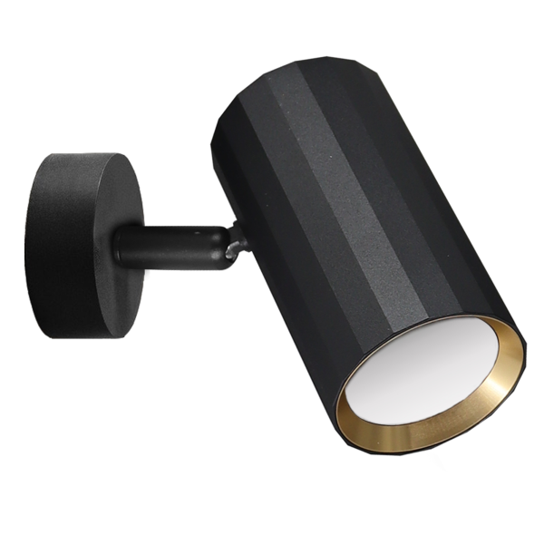 NICEA to nowoczesna oprawa, spot ścienno-sufitowy z wymiennym źródłem światła, wykonana z aluminium w kolorze czarnym ze złotym odkręcanym pierścieniem.