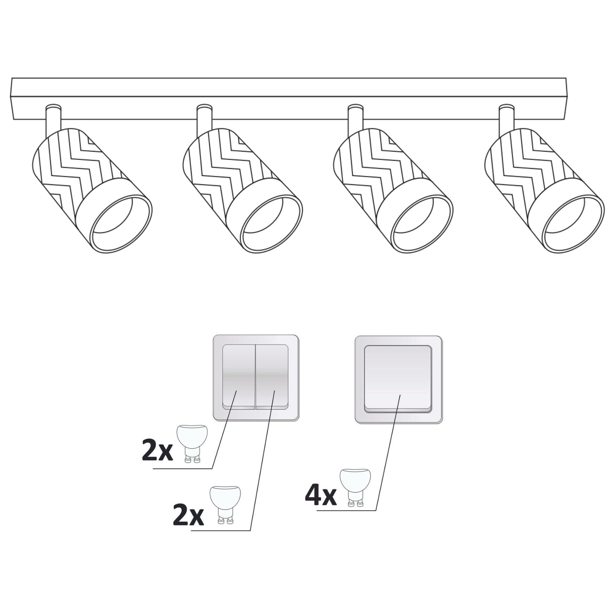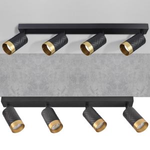 ARRAS to czteropunktowa, nowoczesna oprawa, listwa z wymiennym źródłem światła, wykonana z aluminium w kolorze czarnym, ze złotym odkręcanym pierścieniem.