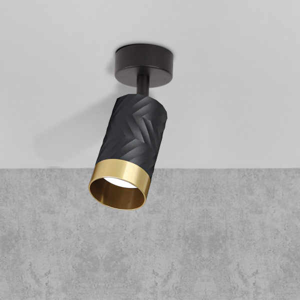 ARRAS to nowoczesna oprawa, spot ścienno-sufitowy z wymiennym źródłem światła, wykonana z aluminium w kolorze czarnym ze złotym odkręcanym pierścieniem.