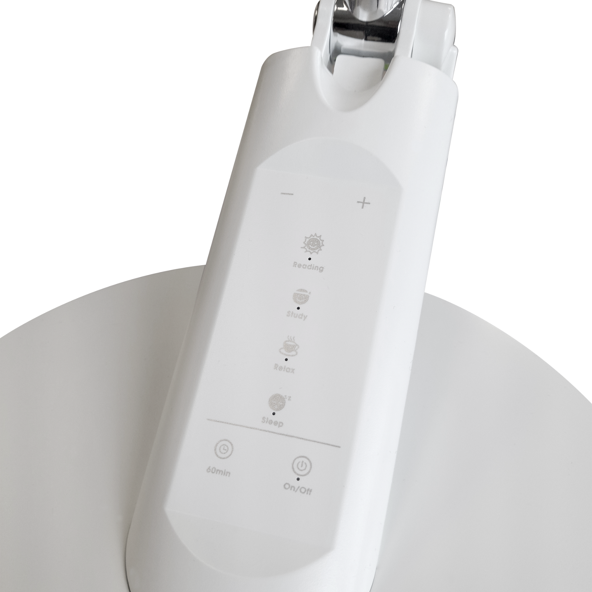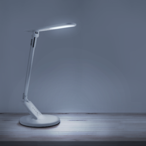 Nowoczesna lampka biurkowa LED wykonana z tworzywa sztucznego połączonego z metalem, przeznaczona do zastosowań mieszkaniowych jak i biurowych.
