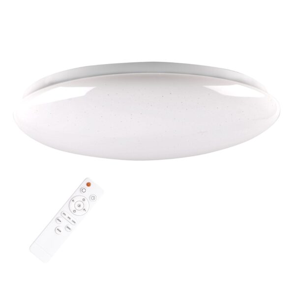 Plafon z pilotem za pomocą którego można płynnie zmienić barwę świecenia od ciepłej białej przez neutralną po zimno białą (3000K-4000K-6000K) oraz wybrać ilość światła, plafon z możliwością ściemniania.