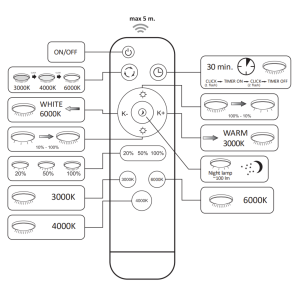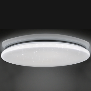 Plafon z pilotem za pomocą którego można płynnie zmienić barwę świecenia od ciepłej białej przez neutralną po zimno białą (3000K-4000K-6000K) oraz wybrać ilość światła, plafon z możliwością ściemniania.