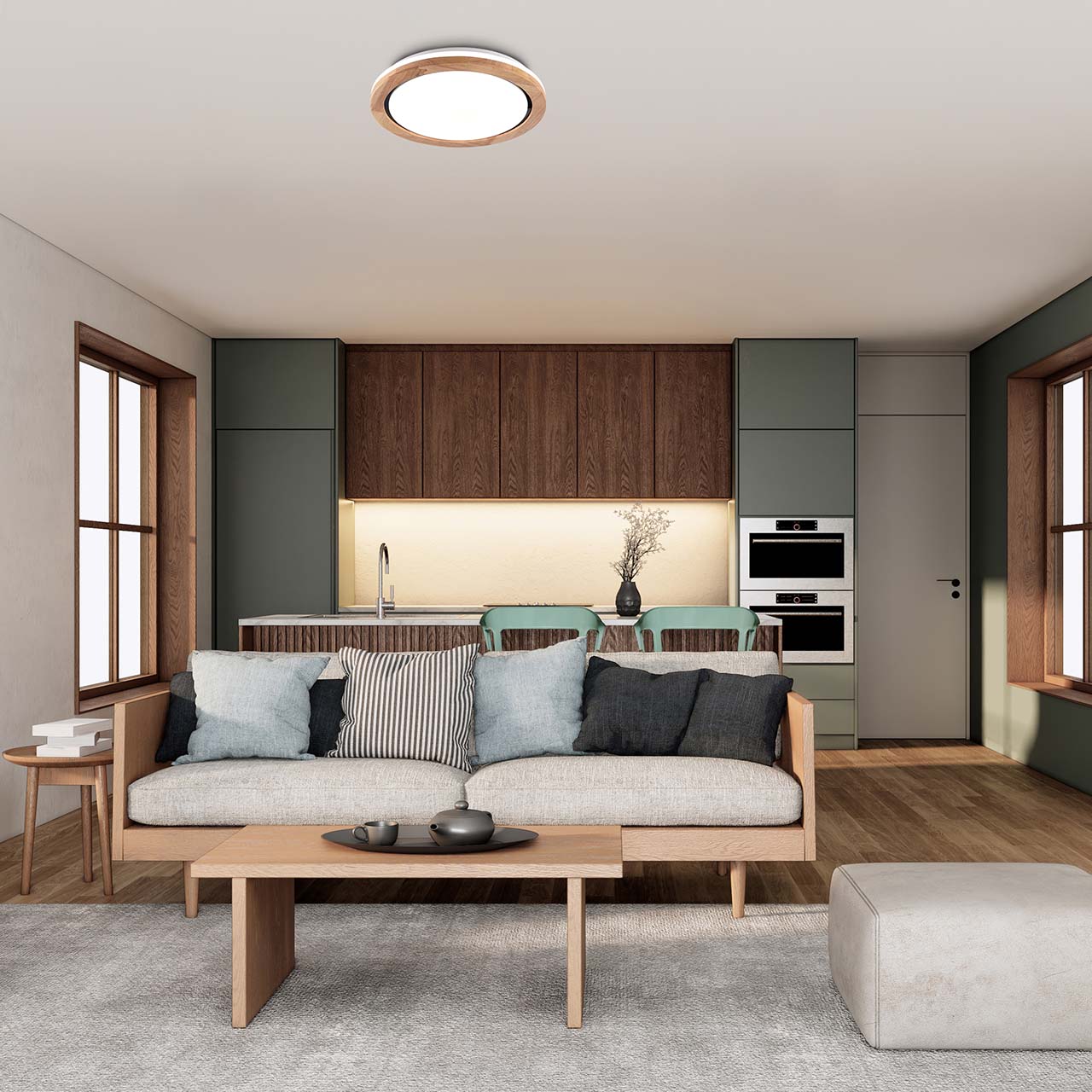 Plafon DAREK 40 to stylowe połączenie nowoczesnej technologii LED z naturalną elegancją drewna. Wyposażony w mleczny klosz z trwałego PMMA oraz dekoracyjny pierścień z dębowego drewna, tworzy harmonijną formę, która świetnie odnajdzie się w wielu aranżacjach wnętrz.