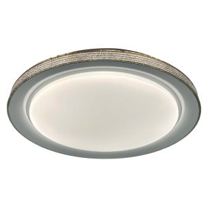 Subtelnie dymiona obręcz z błyszczącymi drobinkami tworzy efekt eleganckiej, miękkiej poświaty. Plafon świetnie komponuje się z wnętrzami: nowoczesnymi, glamour, minimalistycznymi oraz klasycznymi z nutką dekoracyjności.