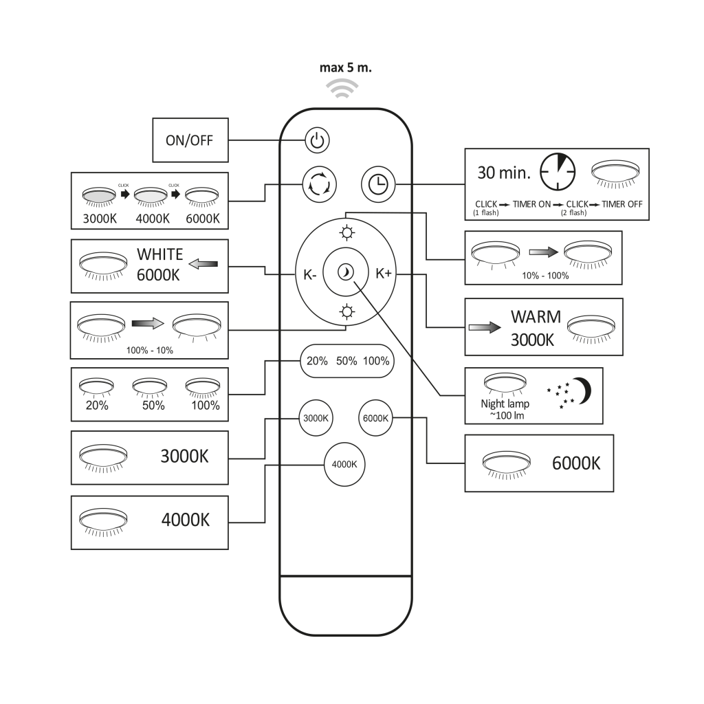 Produkt można ściemniać przy pomocy zainstalowanego układu elektronicznego. Zalecamy włączanie i wyłączanie plafonu pilotem. Przy włączaniu/wyłączaniu pilotem plafon zachowa ostatnie ustawienia. Przy użyciu przełącznika naściennego plafon zachowa ostatnie ustawienia tylko wówczas, gdy między wyłączeniem a włączeniem (lub włączeniem a wyłączeniem) zachowasz odstęp co najmniej 10 sekund. W przeciwnym razie plafon wróci do ustawień fabrycznych.