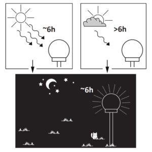 - Czas świecenia po całkowitym naładowaniu akumulatora: max 6h, (mierzono latem, akumulator ładowany w warunkach słonecznej pogody w ciągu dnia)