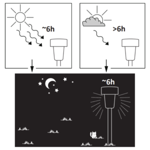 - Czas świecenia po całkowitym naładowaniu akumulatora: max 6h, (mierzono latem, akumulator ładowany w warunkach słonecznej pogody w ciągu dnia)