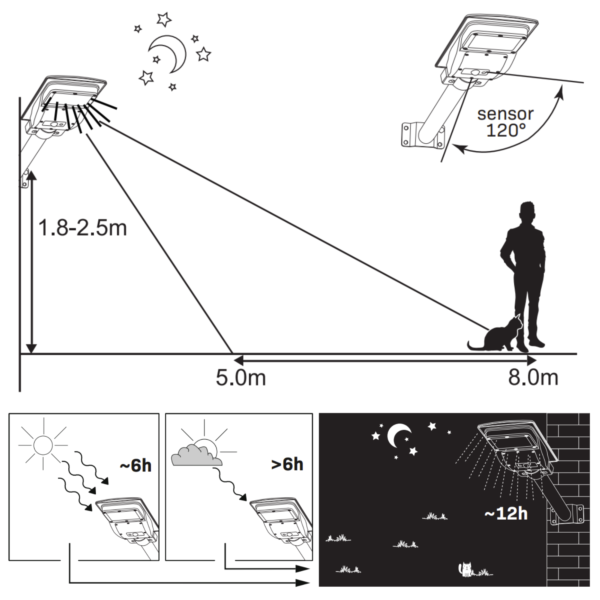Solarny naświetlacz LED z czujnikiem ruchu i zmierzchu ładowany za pomocą panelu słonecznego. Idealny do oświetlenia miejsc, w których nie ma dostępu do zasilania elektrycznego. Świetnie sprawdzi się przed domem, w ogrodzie, nad garażem czy wokół altanki .Lampa solarna doskonale nadaje się też do oświetlenia: ulic, alejek, chodników, tarasów, ogródków działkowych. Naświetlacz automatycznie włącza lampkę po zmierzchu i wykryciu ruchu.