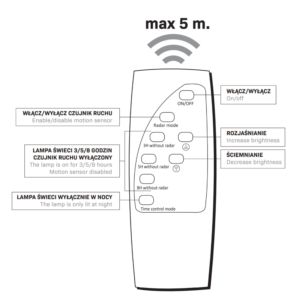 Sterowanie lampy poprzez dołączony pilot zapewnia wiele możliwości, takich jak między innymi intensywność oraz czas świecenia latarni.