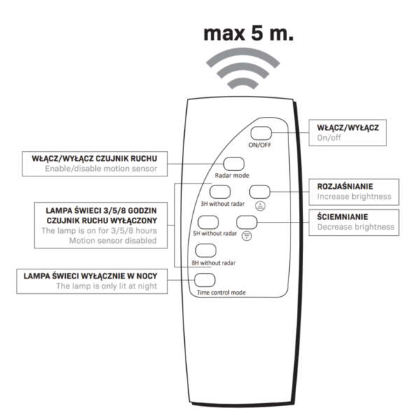 Zakres obsługi zdalnym pilotem do 5 metrów.