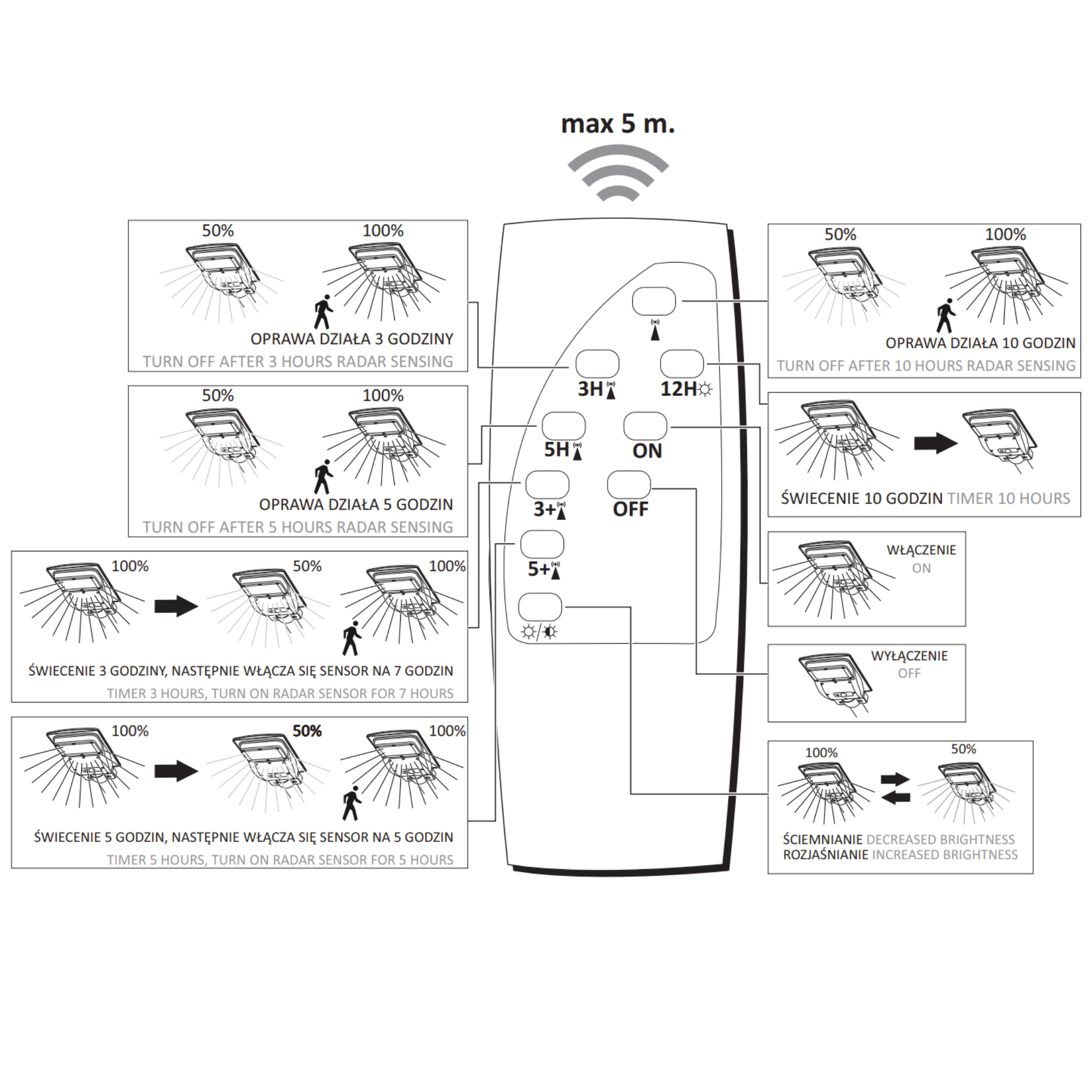 Zakres obsługi zdalnym pilotem do 5 metrów.