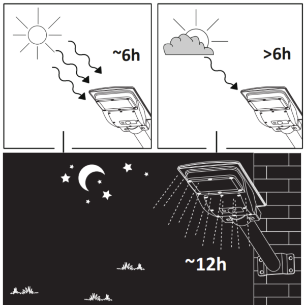 - Czas świecenia po całkowitym naładowaniu akumulatora: max 8h, (mierzono latem, akumulator ładowany w warunkach słonecznej pogody w ciągu dnia)
