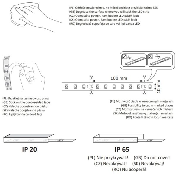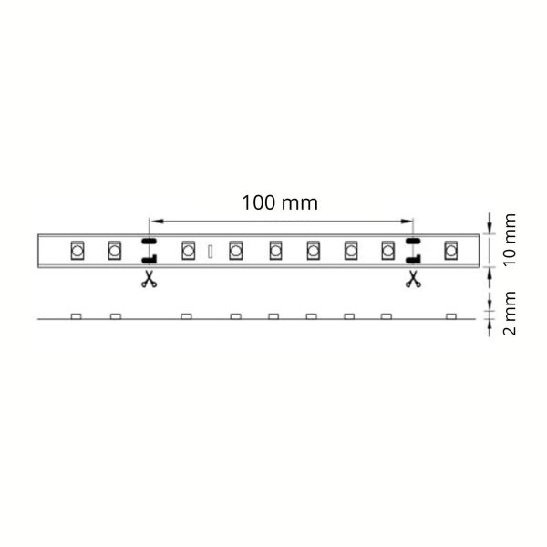 - Możliwość cięcia w wyznaczonych miejscach co 10 cm = 6 x LED – miejsce cięcia oznaczone na taśmie LED