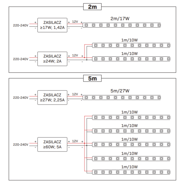 - Do zasilania 5m taśmy z jednego przyłącza zalecamy stosowanie zasilacza do taśm LED 12V; ≥ 27W