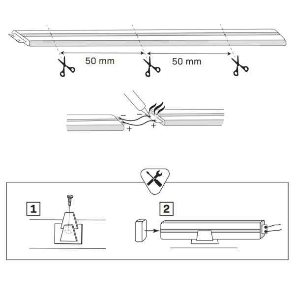 - Możliwość cięcia w wyznaczonych miejscach co 50mm = miejsce cięcia oznaczone na taśmie LED