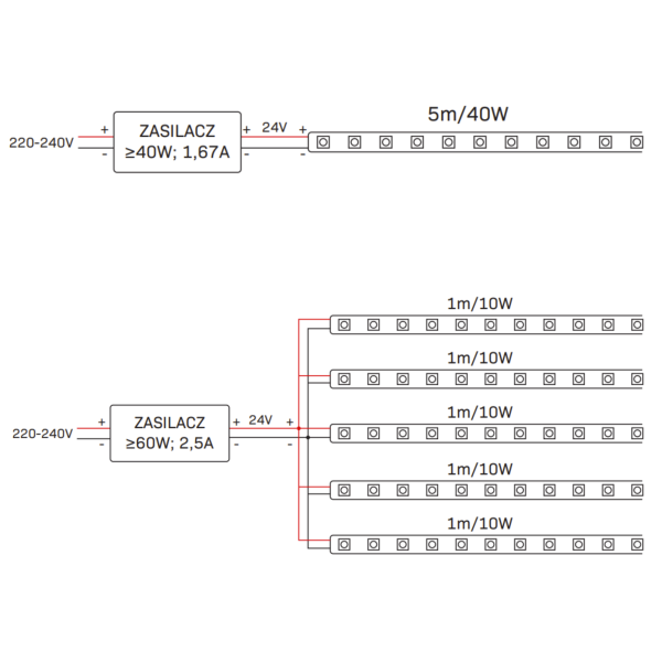• Do zasilania 5m taśmy z jednego przyłącza zalecamy stosowanie zasilacza do taśm LED 24V; ≥ 48W