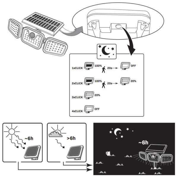Solarny naświetlacz LED z czujnikiem ruchu i zmierzchu ładowany za pomocą panelu słonecznego. Idealny do oświetlenia miejsc, w których nie ma dostępu do zasilania elektrycznego. Świetnie sprawdzi się przed domem, w ogrodzie, nad garażem czy wokół altanki.