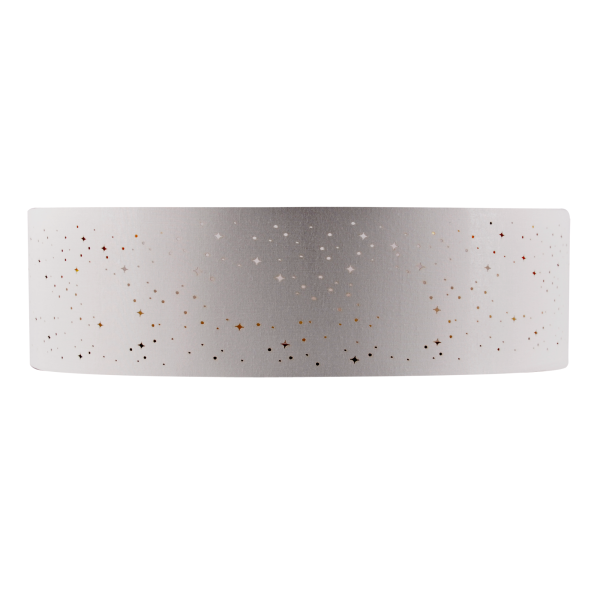 Zewnętrzna biała obudowa kontrastuje ze złotym, błyszczącym wnętrzem, z którego wydobywa się wyjątkowo ciepłe i miękkie światło. Dodatkowym walorem wizualnym są otworki w abażurze przypominające rozgwieżdżone niebo.