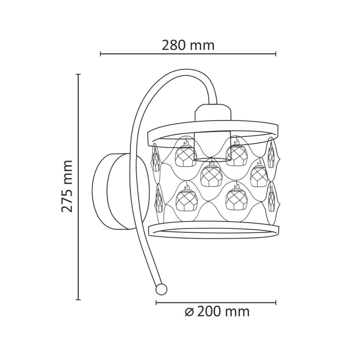 Lampa została wykonana z metalu w kolorze czarnym. Klosz lampy również zrobiony z metalu pomalowanego na czarno z delikatną plecionką z drucików i wykończony czarnymi obręczami. Pomiędzy wzorem zawieszone zostały transparentne kryształowe kuleczki. Po zapaleniu lampy, kryształki przepięknie odbijają światło, tworząc tym samym niepowtarzalny efekt wizualny.