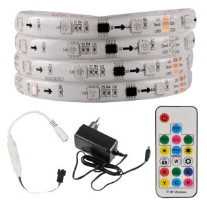 - Zestaw zawiera taśmę LED 2m, kontroler, pilot (bateria w komplecie), zasilacz do taśm LED 12V, 1A, 12W, instrukcja obsługi