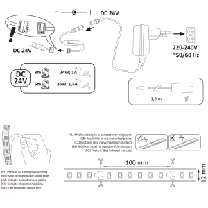 - Zestaw zawiera taśmę LED RGBW IP65 3m, kontroler, pilot radiowy RF (brak baterii w zestawie 2 x AAA), zasilacz do taśm LED 24V DC 1A 24W