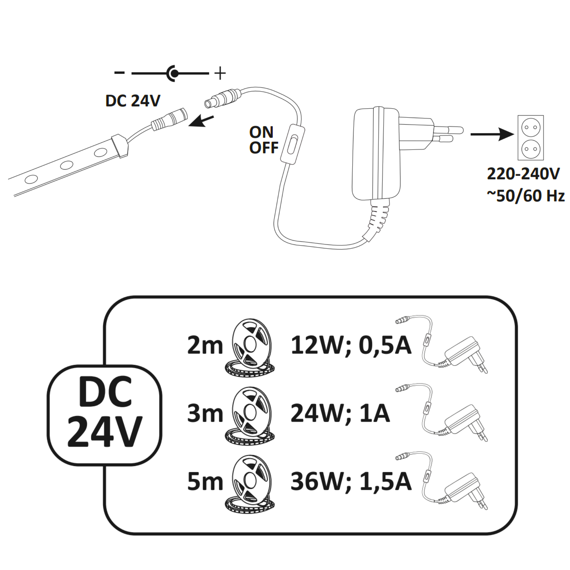 - Taśma 5m wraz z zasilaczem pobiera 36W