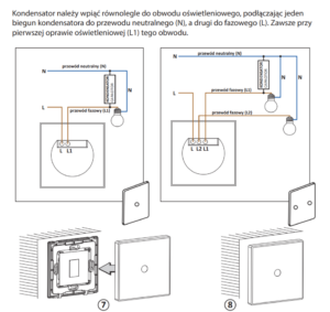 Włącznik światła wyposażony jest w kondensator. Instalacja nie wymaga przewodu neutralnego (N). Pozwala to na montaż urządzenia w każdej istniejącej instalacji. Włącznik podświetlany, sygnalizuje przy pomocy kolorów włączenie i wyłączenie światła.
