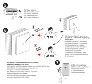 Pobierz aplikację Tuya Smart z Google Play (dla systemu Android) lub App Store (dla systemu iOS), a następnie uruchom ją i zainstaluj według kroków podanych w aplikacji. Możesz również zainstalować aplikację skanując kody QR (znajdują się na końcu instrukcji). W razie, gdyby nastąpiły problemy ze sparowaniem urządzenia z aplikacją, należy zresetować urządzenie. W tym celu przytrzymaj przycisk włącznika znajdujący się na froncie urządzenia przez około 5 sekund i powtórz proces parowania w aplikacji Tuya Smart.